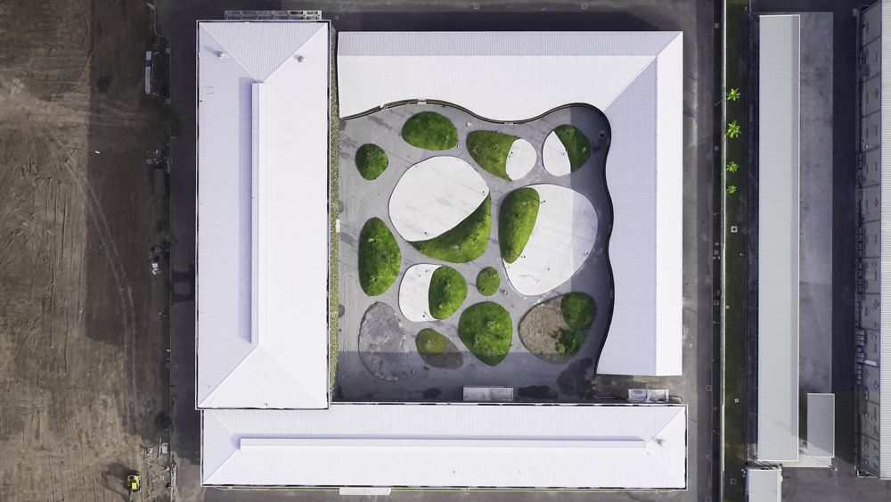 El patio espacioso en el centro del sitio alberga “islas” cubiertas de árboles y césped en formas libres. Entre ellas, los senderos están cubiertos con franjas de grava, permitiendo que la lluvia y el agua superficial se filtre al suelo permeable en época de monzones, en lugar de permitir que las aguas pluviales inunden los drenajes locales. Estas áreas funcionan como importantes diversiones recreativas para empleados, un área de juegos para voleibol, tenis de mesa y equipos deportivos.