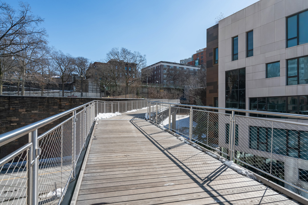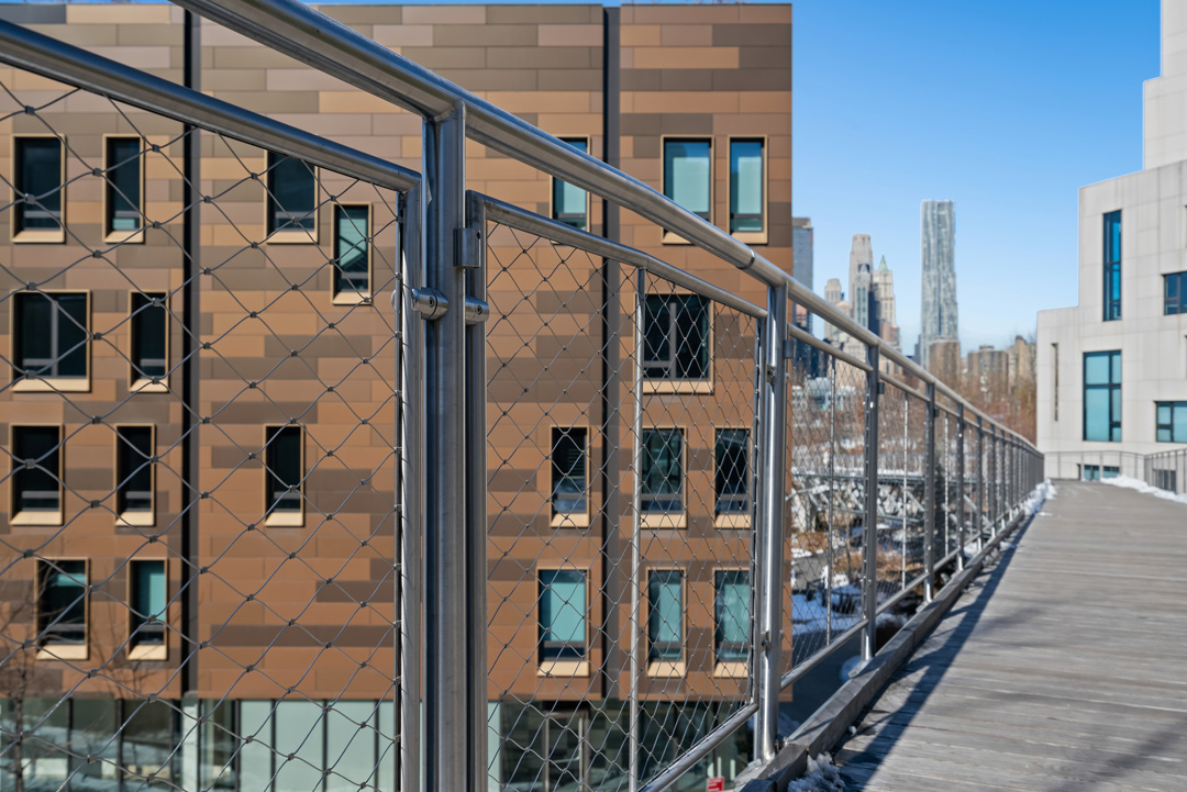 La instalación cubre toda la pasarela zigzagueante de 450 pies, proporcionando protección integral contra caídas mientras preserva vistas sin obstáculos del Brooklyn Bridge Park y el skyline de Manhattan. Nuestro equipo de ingeniería colaboró estrechamente con Arup para asegurar integración perfecta con la nueva estructura de acero y aluminio, utilizando los pilares de soporte existentes tanto por eficiencia económica como responsabilidad ambiental.
